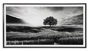 Filled with calming natural elements, this wall art has a refined look with a restful feel. It captures a landscape with rolling hills, drawing your eye to the tree standing tall in the center of the creation. Lighter tones in the clouds bring brightness to the black and white design, making for a striking addition to your modern decor.