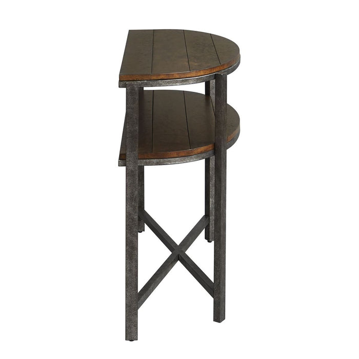 Liberty Breckinridge Demilune Sofa Table in Mahogany 348-OT1030. Slightly raised tops that add dimension and square tube metal legs that flows into a x design. Great open space to storage magazines, books and storage containers.